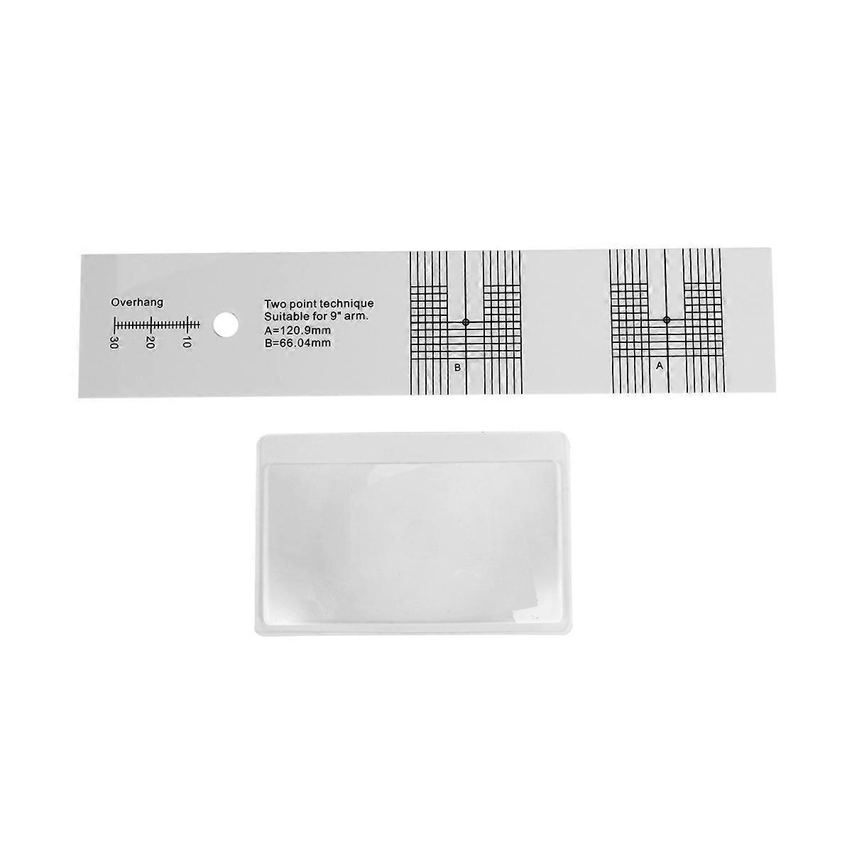 Instructions: 1. Place this protractor on your turntable platter with hole over spindle. 2. Move / tonearm until stylus rests exactly on center of . (120.9mm radius). Check that is square with outer set of grid lines. - If not, loosen mounting screws and twist lightly until it is square. 3. Move / tonearm until stylus rests exactly on center of inner -eye (66.04mm radius), Rotate protractor around spindle as required. Check that is square with inner set of grid lines.If not, change overhang, (move in or out along the axis) until is square. 4. Repeat and 3 till is square at both points. Tighten mounting Features: High contrast alignment protractor provides improved visibility and eliminates tracking errors. Avoids the over- distortion to keep high quality sound Link to turntable setup guide with instructions included, printed directly on the protractor. Works with an S -Shaped arm and any 1/2inch mounted . Extra magnifier make you more clear when adjusting the overhang. colour: white Material: acrylic size: 19x4cm Package Contents: 1 x Overshoot Protractor Only the above package content, other products are not included. Note: Light and different displays may cause the color of the item in the picture a little different from the real thing. The measurement allowed error is +/- 1-3cm.