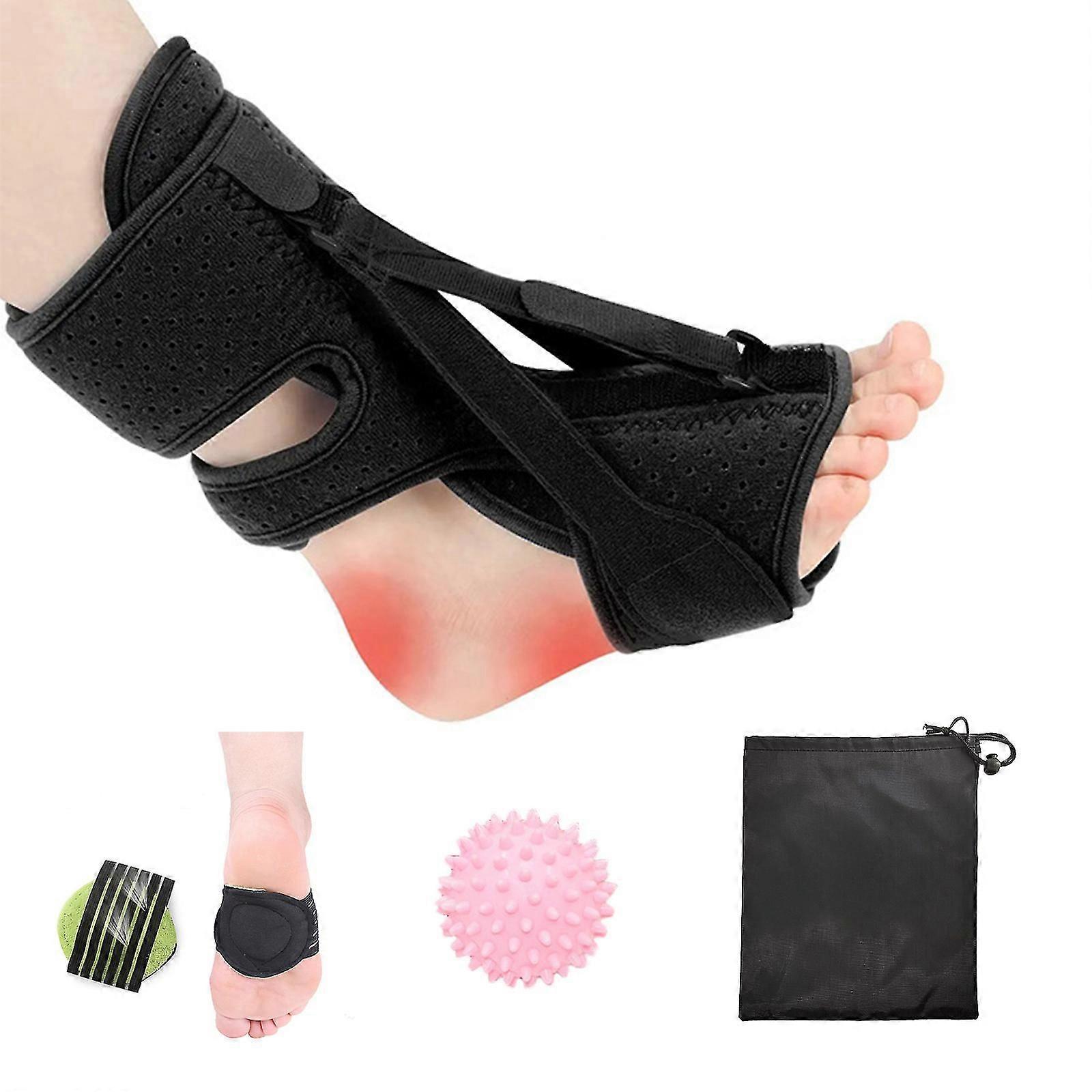 Features 1. Plantar Fasciitis Night Splint is one of the effective ways to reduce morning pain from plantar fasciitis. This unique tool has a distinct advantage over other conservative treatment methods or physical therapy equipment: It works while you sleep or rest. 2. Breathable Soft Foam Padding Lining: Comfortable breathable materials with maximum foam padding at the dorsal position keep you cool all night, feeling smooth against your foot allows you to sleep comfortably throughout the night and wake up in the morning feeling free of plantar fasciitis pain. 3. Adjustable Straps Design: The bendable lightweight aluminum bar at the instep can keeps your feet at a 90-degree angle and hold your foot on a flexed position. You can bend the metal insert and adjust the angle from 90 to 85 degrees for your maximum comfort. 4. Portable: No need to sacrifice comfort on vacation or a work trip. This plantar fasciitis night splint set is portable and very easy to bring. 5. Foot Massage Ball for Deep Tissue Relief: Hard, spiky massage ball is provided for deep tissue massage and increasing blood circulation in the foot which furthers achilles tendonitis relief. Specification Material: Foam cotton Color: Black Package Size: 25 15 3 cm Weight: 160 g, 260 g Package Include: 1 Plantar Fasciitis Night Splint or 1 Plantar Fasciitis Night Splint 1 Massage Ball 2 Arch Pad 1 Drawstring Bag