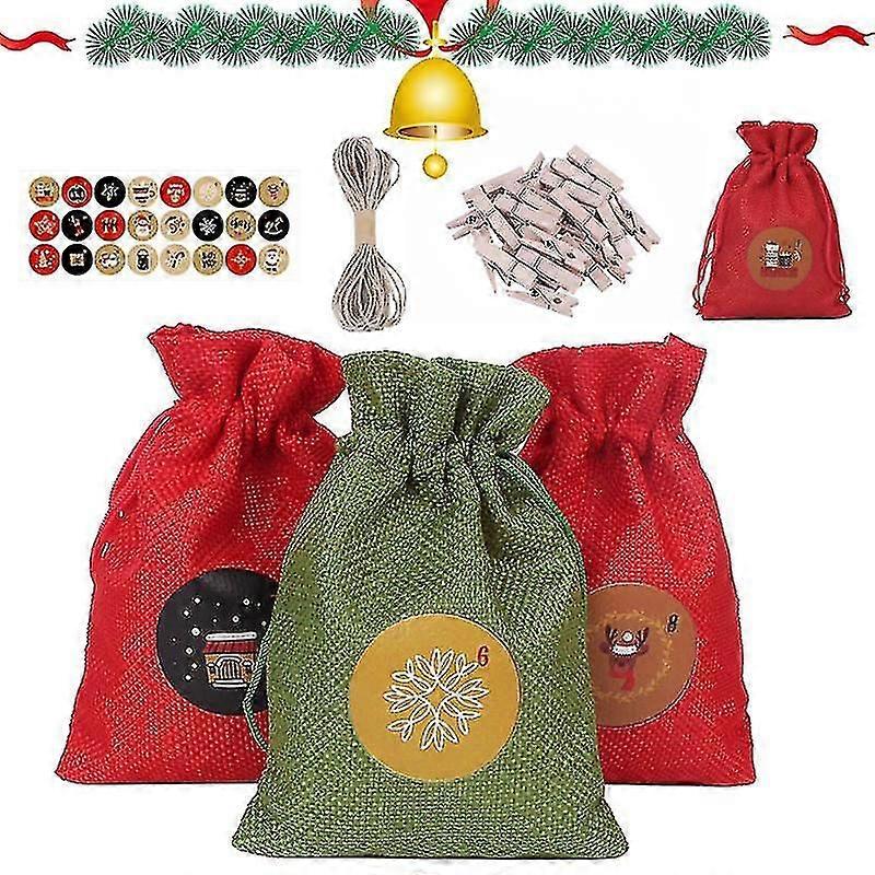 Advent Calendar, 24 Christmas Gift Bags, Christmas Pouch, Fillable Fabric Bags, Gift Bags With Number Tags And 24 Wooden Clips, For Diy Christmas Deco