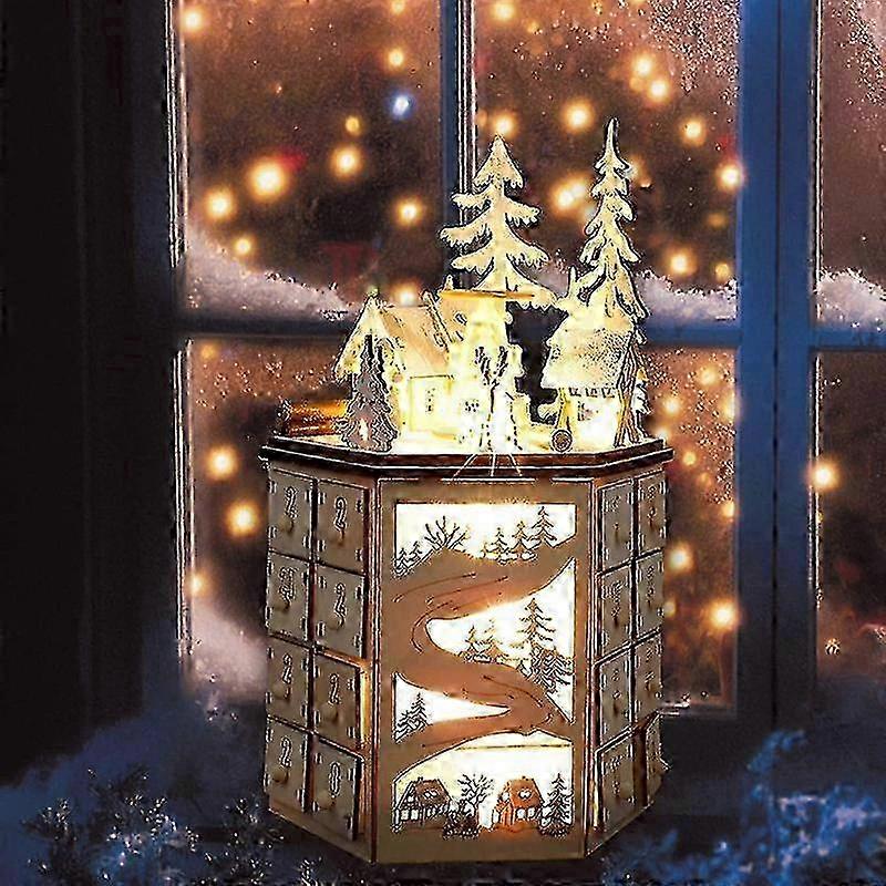 Revolving Music Box Advent Calendar Decorated with Christmas Tree House LED Lights