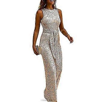جمبسوت نسائي لامع - ملابس أنيقة بلا أكمام مع سروال طويل وحزام