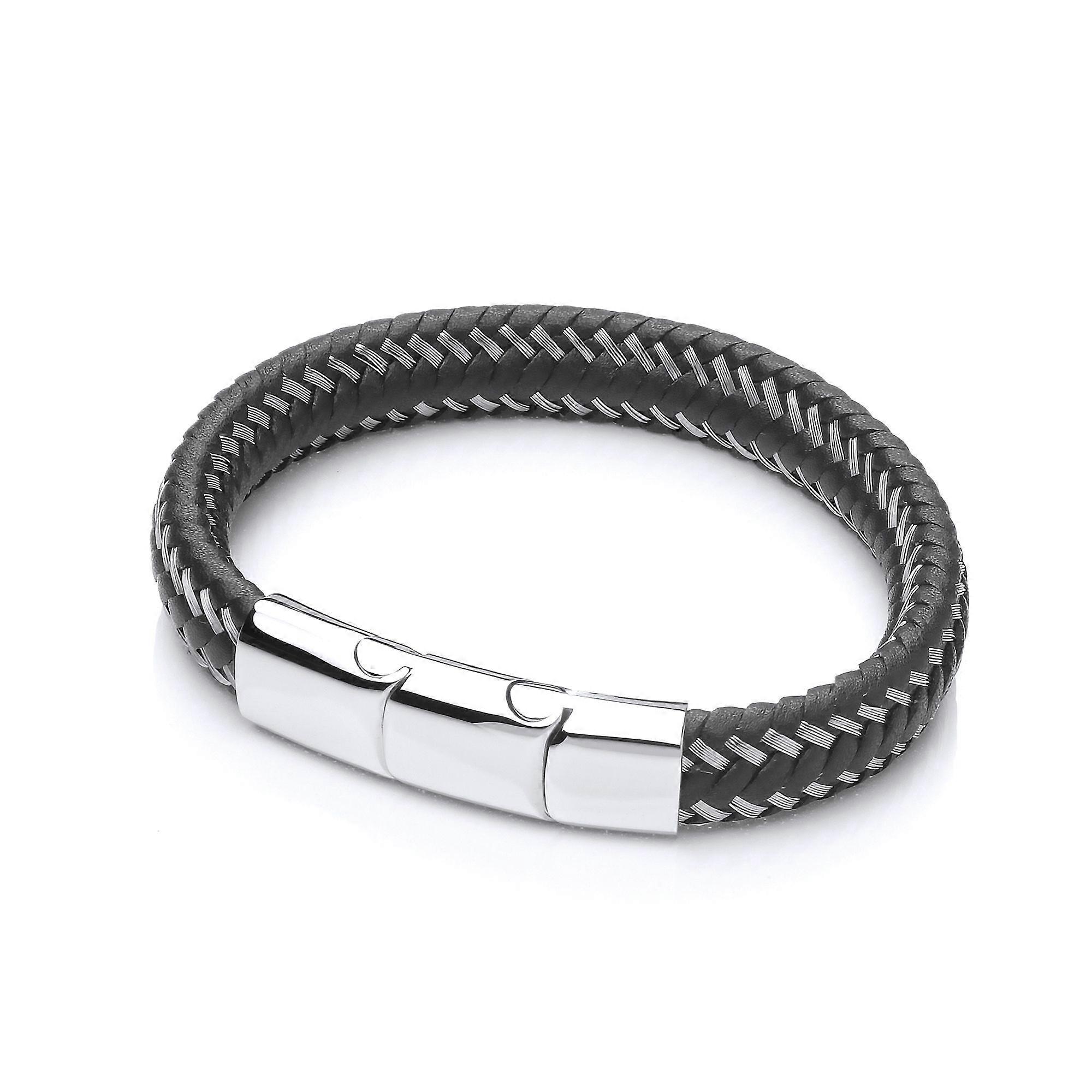 Jewelco London Mens Rhodium Plated Stainless Steel Black Leather Platted Cuff Bracelet 12mm 8.25-9 inch