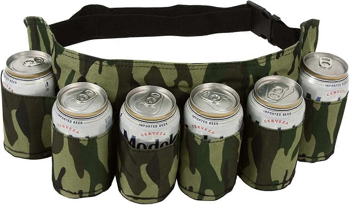 6 PACK BEER HOLSTER MATERIAL: This beer bottles holder belt is made of canvas polyester fabric, waterproof and durable, comfortable and scratch resistant. BEVERAGE CAN HOLSTER DESIGN: The beer can holster can hold 6 packs of 12oz or 14oz beer cans and soda bottles, adjustable strap with buckle, ease the pressure on the waist, easy to carry. Fits waist sizes 30"-54". HANDS-FREE BEER BELT FOR MEN: Never lose your beers again with this handy Beer Belt. Slide the belt around your waist, load it up with 6 cans of beer and it's off the races. Perfect gift for any beer lovers. BEER HOLDER APPLICABLE OCCASIONS: The drink holder belt is ideal choice for parties, gift-giving, beer drinking day, outdoor barbeque, fishing, mountaineering, walking, cycling, camping, hiking equipment. It can also store other party accessories or tools, not limited to beer.