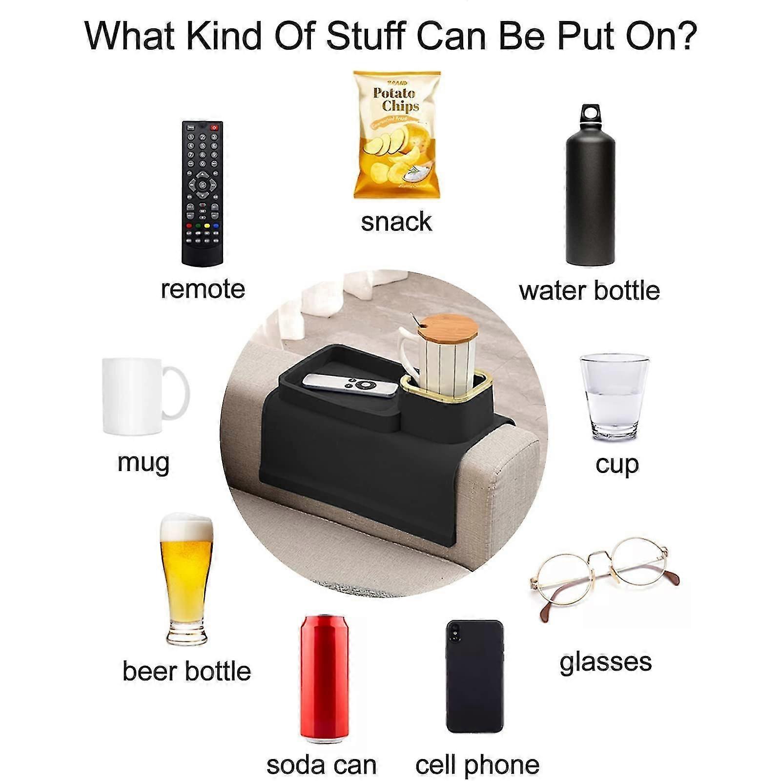 Snacks and Drinks At your FingertipsAre you a person who likes to spend a lot of time on the couch? Do you find it hard to keep your drinks, phone and remote control in one place instead of finding them scattered all over the place and causing chaos? this silicone sofa arm tray keeps everything you need (drinks, snacks, remote control, phone, etc.) at arm's length while you sink into the sofa and enjoy a movie. Human-safe Silicone MaterialThis sofa cup holder is made of food-grade silicone that is safe and non-toxic, will not irritate your skin, and is harmless for human beings. Multifunctional Couch Cup HolderOur couch tray for arm is multifunctional, it can not only hold cups, soda cans, beer, glasses, but also your phone, headphones, remote control or snacks, freeing your hands so you can enjoy your leisure TV time. In addition, you can use it on your sofa at home or in the office, it is suitable for all kinds of sofas with armrests over 15 cm wide. Anti-Slip and Anti-Spill Design Made from premium quality food-grade silicone, this sofa arm table is fit with four metal pipes at the bottom that will clasp onto the arm of your furniture and stay fixed with little or no movement. Also, the edge of the tray has a 2.5cm high protective border to prevent your items from slipping off. For Your Loved OnesThis sofa tray requires no installer and can be used directly, making it a particularly practical and useful gift for family and friends! They are sure to love it!