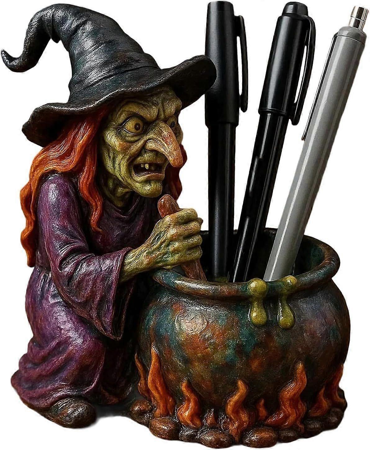 Magic Witch Pen Holder, Witch Cauldron Pen Holder for Horror Fans & Fantasy Lovers, Resin Cauldron Pen Organizer with Spooky Witch Design