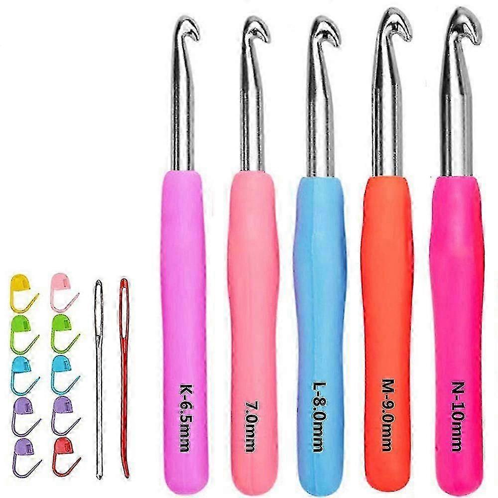 5 SIZES TO CHOOSE FROM: There are 5 crochet hooks with soft rubber handles and aluminium heads in an assortment of eye catching colours. It is easy to identify and select the correct size for every hook is colour coded. These crochet hooks size is 6.5mm 7.0mm 8.0mm 9.0mm 10.0mm. All in one knitting accessories which is the great addition to your crochet & knitting supplies & accessories. RUBBER HANDLES: Our crochet hooks are made of ergonomic rubber handle which are so easy to grip. Our crochet hooks which feel great to the touch are lightweight but sturdy and no rubbing compared with traditional crochet hooks. The rubber handles make it easy to work the hook through the finest of wools and threads. The Comfortable Handle makes you crochet for hours without experiencing cramps, sore or tired fingers. Also good for people with Arthritis or Carpul Tunnel Syndrom. EASY TO USE: Fantastic for adults or kids, beginners, Intermediate or more Experienced Crocheters. The hook size is on the soft peach feel handles and all are different colours so it was easy to see which hook you are using and pick it up again after putting it down, without checking that it was the correct size. There is a beautifui zippered carrying case for our crochet set allowing you travel anywhere with them. PERFECT GIFT: It is a fantastic gift for craft lovers of most ages and experience. Our great crochet set makes you create beautiful craft designs which could as gifts to your family and friends - Also a Perfect Gift to your mom, grandma, friends who loves knitting. You and Your loved ones could crochet for hours comfortably.