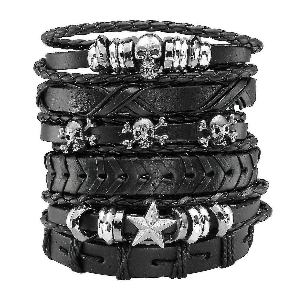 Pack Of 6 Braided Wide Pu Leather Bracelet With Skull Star Women Men Punk Black