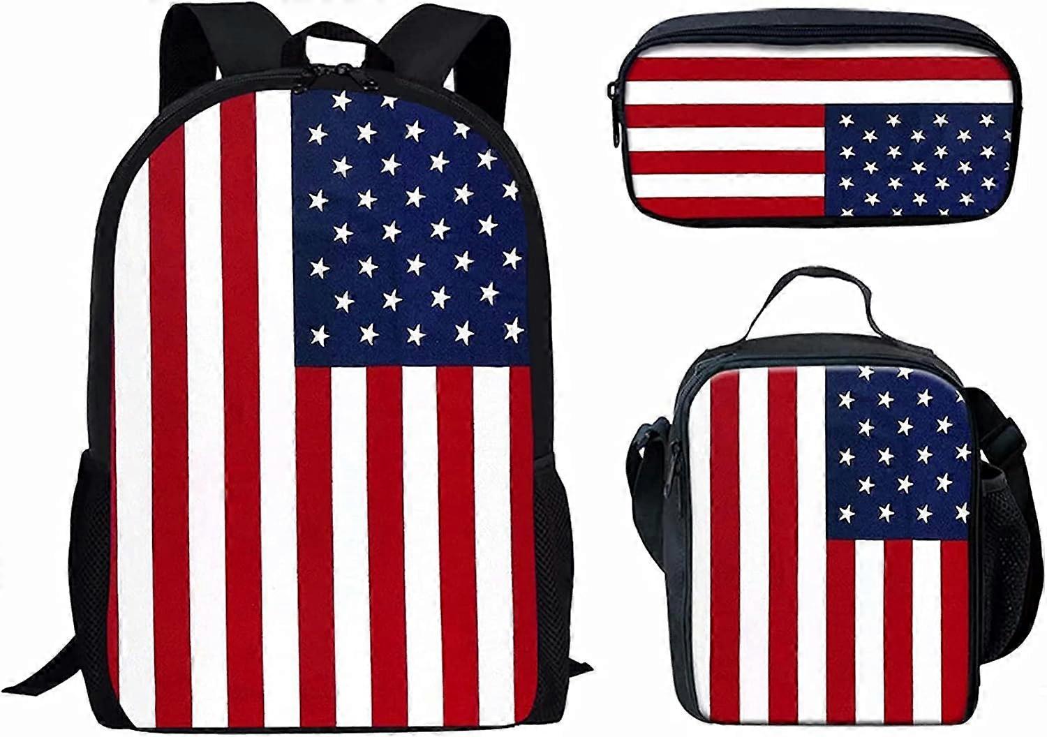 School Bags American Flag Patriotic Decor Shoulder Backpack for Teen Students College Book Bag with Insulated Lunch Box Pencil Case