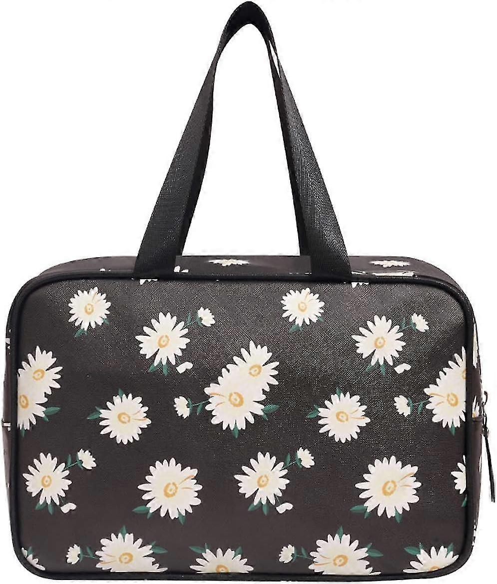 Large CapacityToiletry bag size 11.8"x7.8"x4.7"/30x20x12cm, a main compartment and two internal mesh pockets can easily put your cosmetics and toiletries, such as shampoo, shower gel , Cosmetics, lotions, toothpaste, toothbrushes, etc. Waterproof The leather material on the surface of the wash bag can be waterproof, just wipe it lightly. High Qualityhe beautiful and fashionable cosmetic makeup bag is made of soft PU leather, high-quality polyester lining, reliable zipper, and durable. Handle Design Portable handle travel toiletry bag, easy to carry, can be easily loaded into the backpack, and travel with you easily. Multi-PurposeThe toiletry wash bag adopt fresh daisy patterns, which are beautiful and unique, suitable for daily use or travel, and can be used as a toiletry bag, cosmetic bag, travel toiletries storage bag, shaving bag, etc. It is a great gift for women and girls.