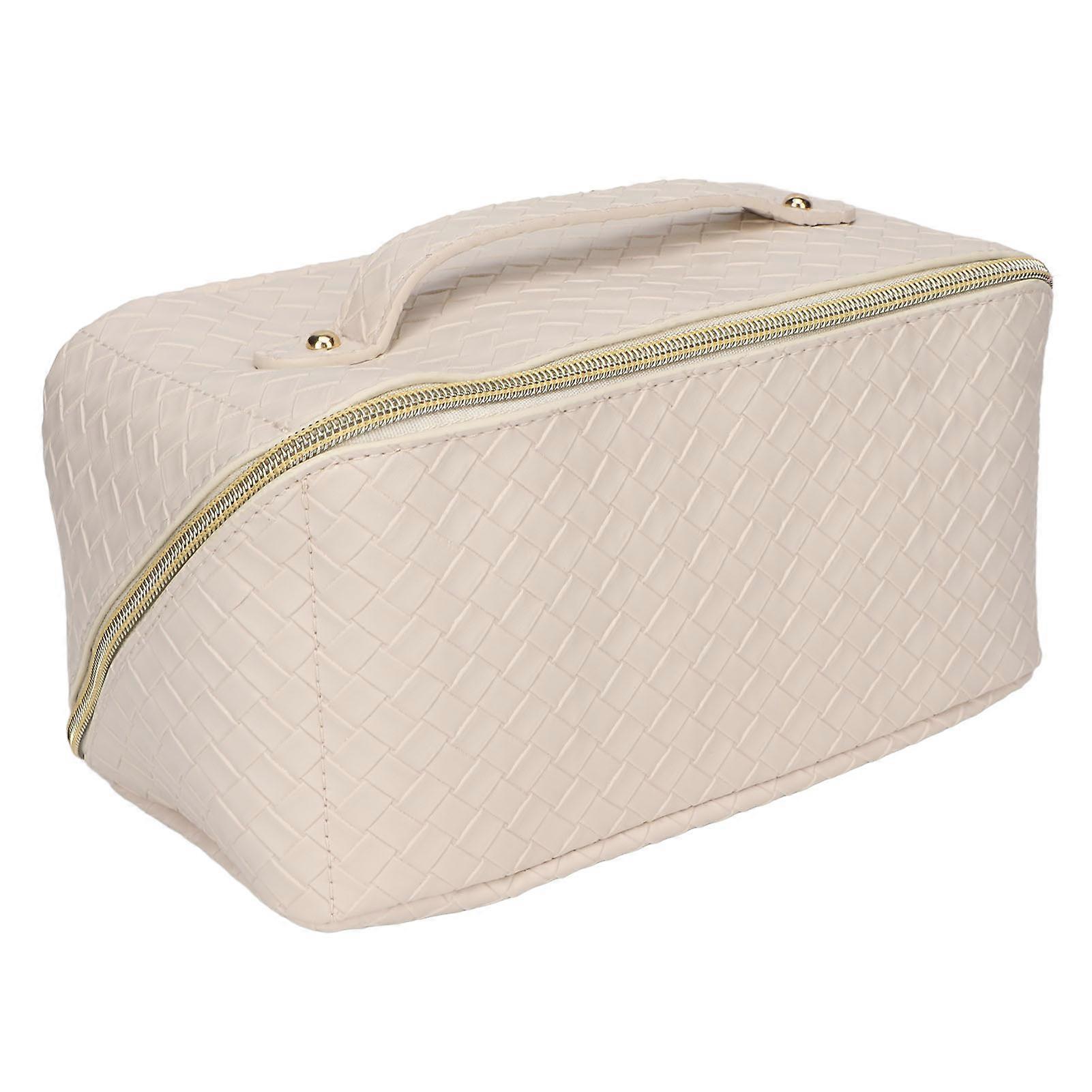 Makeup Storage Bag PU Leather Woven Pattern Zipper Closure Cosmetic Organize Pouch for Travel White