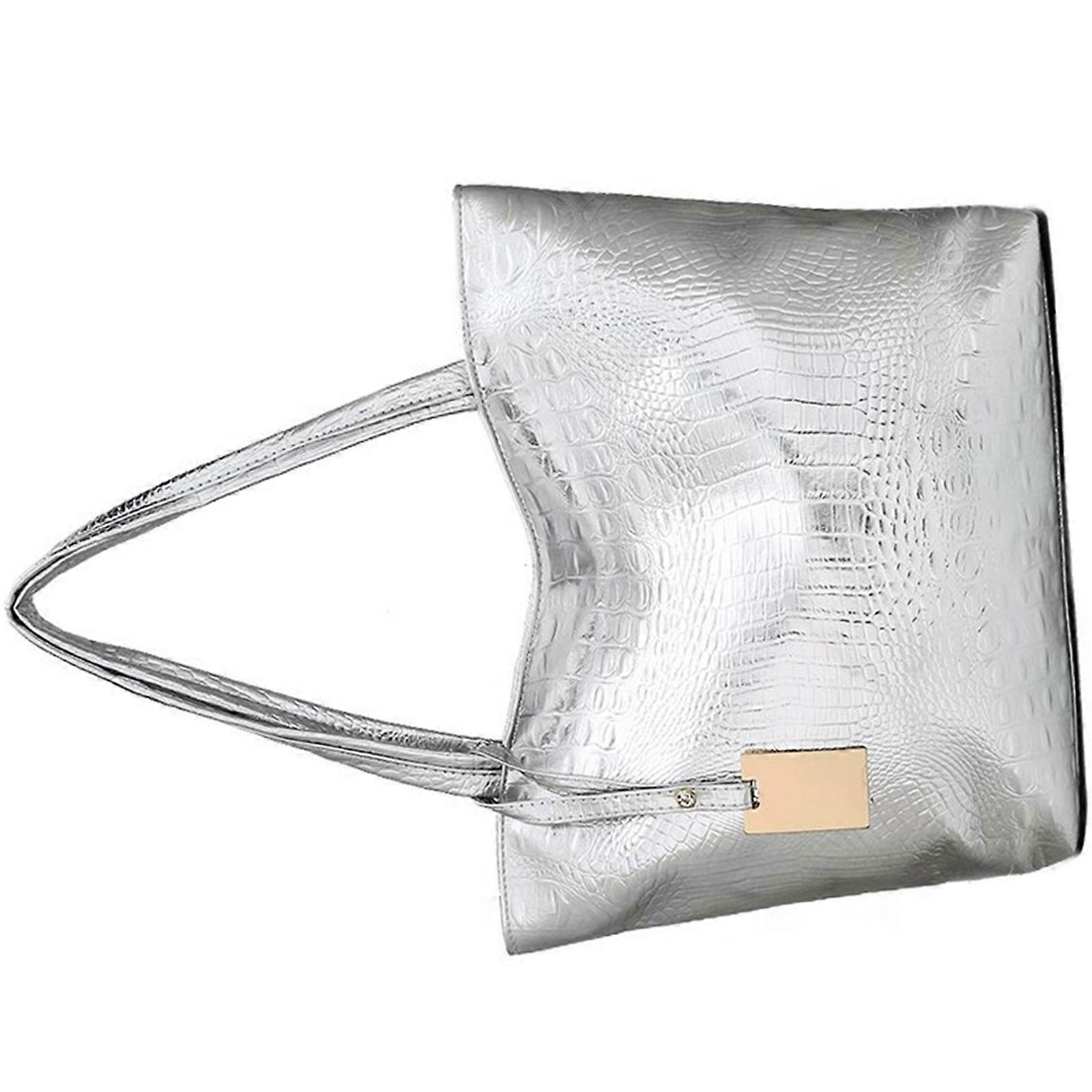 Womens PU Leather Bag Large Capacity Shopping Bag Casual Big Shoulder Bag Sparkly Metallic Alligator Pattern Handbag Silver