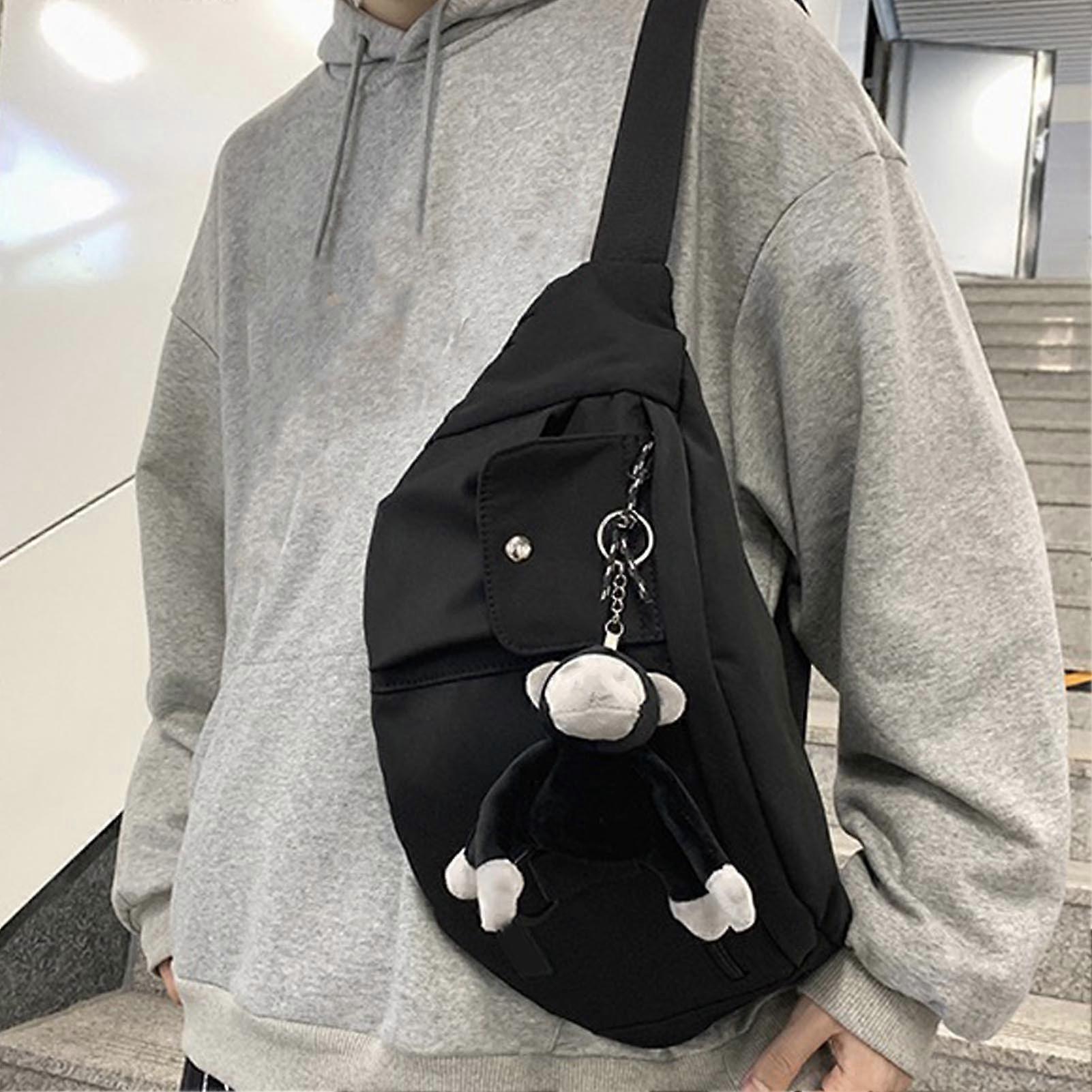 Men Nylon Sling Bag with Gorilla Pendant Casual Black Shoulder Bag