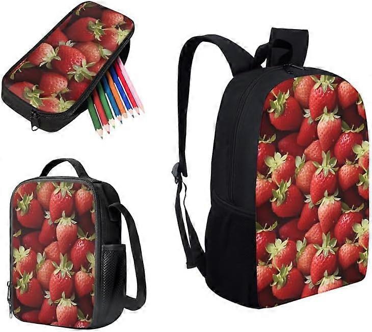 Vivid Cute Strawberry School Backpack Boys Girls Kids School Bookbag Set with Strawberry Hand Drawing Lunch Box and Pencil Case for Kids Boys Girls Ba