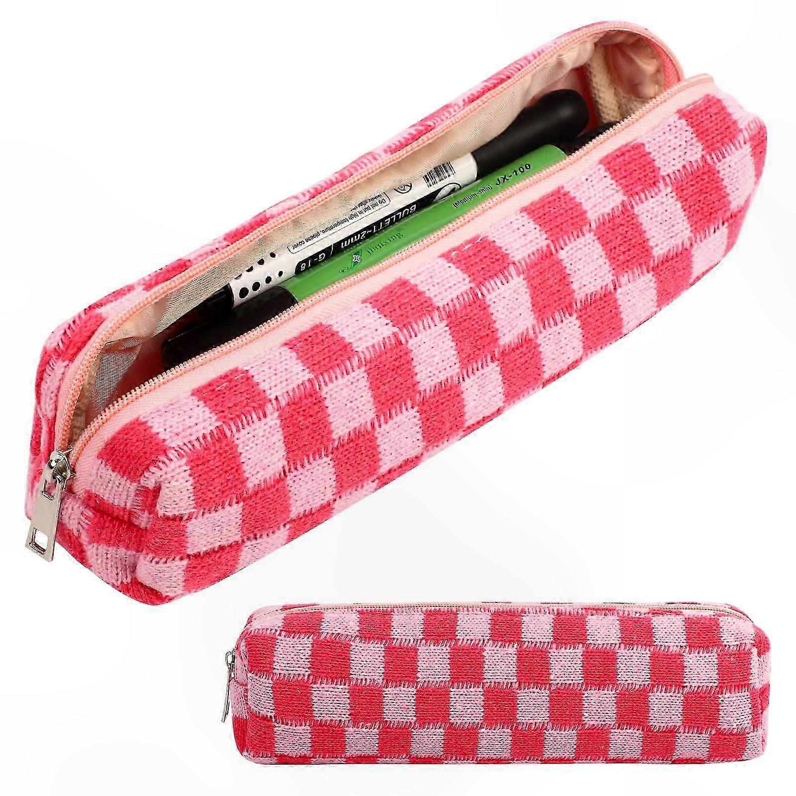 Plaid Knitted Pouch for Makeup and Stationery, Checkered Coin Bag for School and Office Use (Pink)