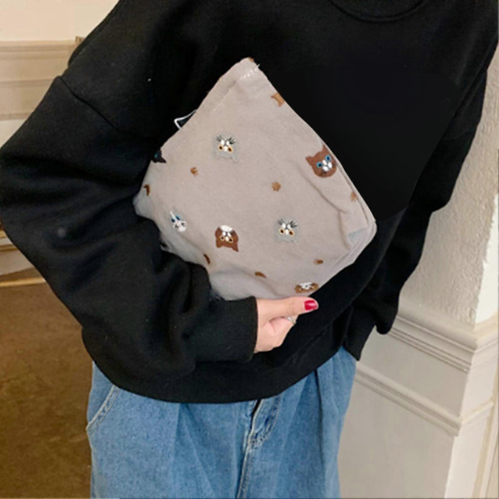 Canvas Makeup Bag Grey Cat Embroidery Zipper Travel Pouch