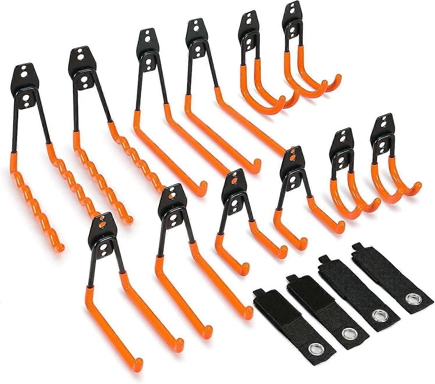 Multi-sizes: There are 12 ladder wall hooks in 6 different sizes: 2 large wave hooks, 2 large square garage hooks, 2 medium square garage hooks, 2 small square garage hooks, 2 large shaped storage hooks of J and 2 small J-hooks; also comes with 4 storage straps. UNIQUE WAVE HOOKS: Our double arm wall hook set adds two large wave hooks. Garage hooks have a wavy texture that increases friction and are suitable for hard-to-organize tools (such as pipes, ropes, steel wires, etc.) to ensure they don't slip easily. /p> Storage strap: made of nylon and metal eyelet. It can support up to 20 kg. The hole at the top of each storage strap allows them to be hung individually, which is ideal for storing extension cords and organizing the garage. 2 kinds of screws: Workshop hooks provide 2 kinds of screw sets for different walls, such as drywall, wall studs and other wall types. It comes with 48 screws and 48 anchors in the package. MULTIPLE USES: Synlyn hooks easily store large items like bikes, ladders, garden tools, surfboards, hoses, kayaks, lumber, exercise equipment, and more. Ideal for organizing your home!