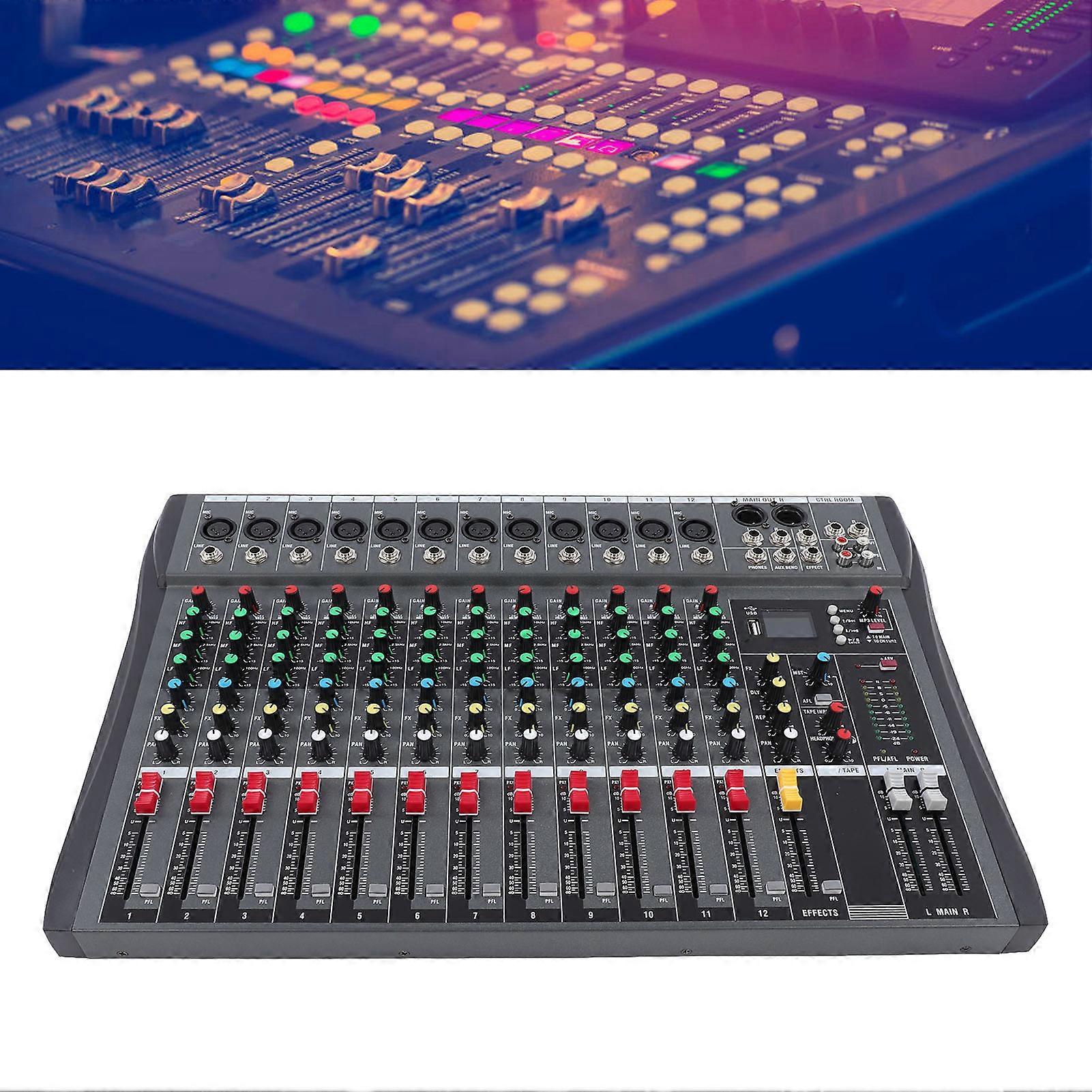 Audio Mixer Professional 12 Channel BT Function Sound Mixing Console for Home Parties Broadcast AC100‑240V Item Type: Audio Mixer Material: ABS, Aluminum Alloy Input Voltage: AC100-240V Output Voltage: 48V Basic Parameters: Maximum Input Level: MIC and 24dBu Line and 24dBu Maximum Output Level: XLR and 26dBu TRS and 20dBu Master Meters: 10 segment 24dB to CLIP Channel Meters: 1 LED signal indication Frequency Response: 20Hz to 30KHz 0.5dB Common Mode Rejection Ratio (MIC 1kHz) (CMRR (MIC 1kHz)): Greater than 75dB THD and N: Less than 0.01% (Channel to mix out) Crosstalk at 1kHz: Fader shutoff greater than 85dB Mute shutoff greater than 85dB Noise, rms 22Hz to 22KHz: EIN -122dBu Residual output noise less than -90dBu MONO EQ: LF, shelving,+/-15dB, 12KHz HM, peak, dip,+/-15dB, 2.5KHz LF, shelving,+/-15dB, 80Hz Mono Channel: XLR balanced, pin 2 hot, 2K ohm, Sensitivity -60 to +10 dBu TRS balanced, tip hot, 10K ohm, Sensitivity -40 to +10 dBu XLR, phantom and 48V 2 Track Return: RCA, unbalanced, 4K ohm, -2 dBu 2 Track Send: RCA, unbalanced, less than 75 ohms, -2 dBu L R Output: XLR balanced, pin 2 hot, less than 75 ohms,+4 dBu, Maximum +22 dBu FX AUX Output (Headphones): TRS unbalanced, tip hot, less than 75 ohms, -2 dBu, Maximum +18 dBu Headphones: TRS, tip L, ring R, 30 to 600 ohm headphones recommended Maximum Power Input Power: 15watts