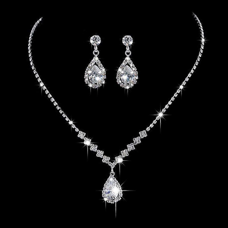 Vintage Crystal Waterdrop Pendant Necklace Earrings Silver Wedding Jewelry Set