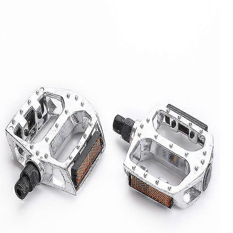 Bicycle pedals white aluminum alloy mountain death fly ankle road bike universal ball bearing The gorgeous anodized surface won't fade,super light and very durable,suit for all bicycles. Perfect for Upgrading or Replacing Old Pedals.Made of aluminum alloy, will fit all mountain, trekking and road bikes. Non slip nail design to keep you safe, increase pedaling efficiency. Color: silver Size: 9.5X10cm Quantity delivered: 2 pieces