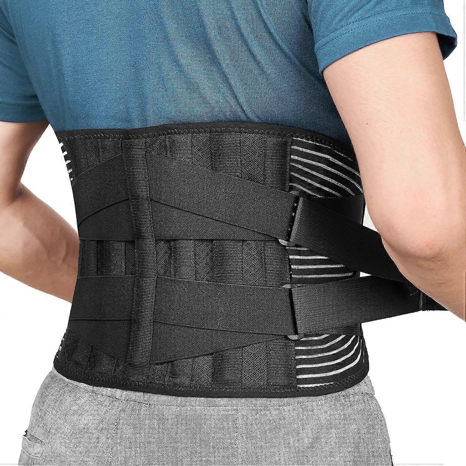 【Relieve LOWER BACK PAIN 】Back brace contains 4 Memory-aluminum stays that are quadruple harder than the commonly used PP strips,and 2 steel springs placed along the waist side, offer 360° stronger vertical support to lower back,prevent excessive rolling of your muscles and decrease the pressure on your discs . 【PREVENT BACK INJURIES】Back support with 2 elastic straps are designed to add extra compression around lower back to prevent back injuries from weight lifting, long time standing or sitting, doing housework, working, etc. Relief waist muscles ache, disc herniation, sciatica, scoliosis etc when wearing the back belt. 【WELL WEAR UNDER CLOTHES】The back support made of 4-way stretch elastic material,3D knitting technology by different compression levels, for superior fit,breath and comfort. The inner layer is made of velvet fabric, giving an ultimate baby-skin-like silky touch,perfect for dressing internally. 【CONSIDERATE DETAIL DESIGN】2 Silicone anti-skid bands are designed on the 2 sides of the waist,prevent the waist support belt from rolling up when sitting, bending or doing other activities.The 1.5''*3.7'' wide size Touch Fasteners of 2 elastic straps provides strong adhesion far beyond your expectations, made of PVC material that usually used for babies clothes,will not scratch your skin or damage your clothes.