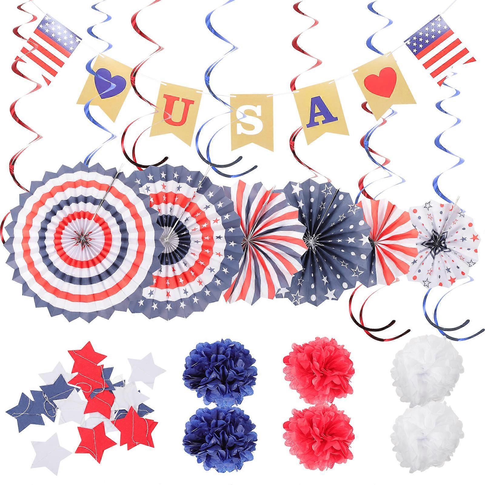 Independence Day Decor American Hanging Swirls Fans Pom Poms Party Supplies 1 Set