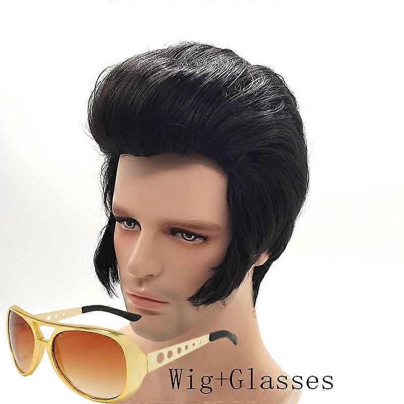 Men's Rock Singers Elvis Aron Presley Cosplay Wig Party Elvis Presley Heat Resistant Black Synthetic Party Hair Wig + Wig Cap