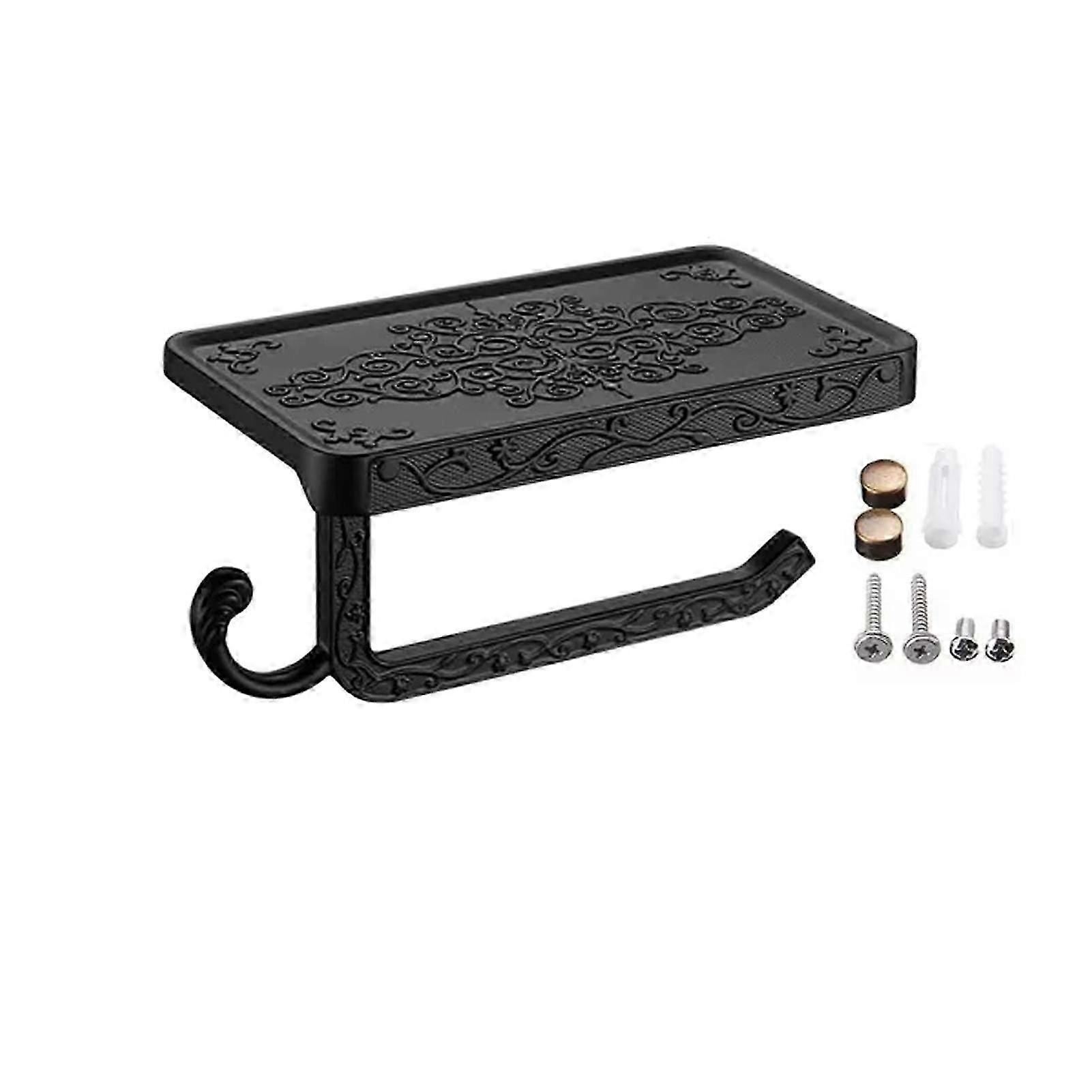 Black Paper Roll Rack with Phone Storage Shelf Aluminum Vintage Toilet Paper Towel Holder for Bathroom Black