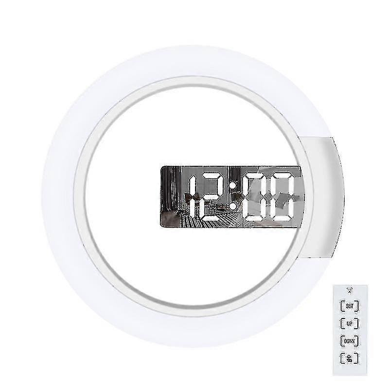 Product MaterialPlastic ColorMulticolor ShapeRound Package Display Host*1 Remote control*1 usb power cord *1 Instruction *1 1.LED Digital ClockLED time display, 12/24 hour format option, battery backup, mirror function.Temperature display in Celsius or Fahrenheit, range from 0-degree centigrade to 50-degree centigrade. or switch.This beautiful wall clock makes your house/office elegant when you hang it on the wall. Make your room a stylish and modern atmosphere. 2.Snooze FunctionAlarm and snooze, 2-minute buzzer and 5-minute interval time in default snooze. 3.Remote Control FunctionRemote control with four function touch buttons (SET, UP, SET, touch key). All functions are set via remote control for easy use. The remote control can be attached to the wall or magnetically attached to the metal surface.Very convenient and applicable. 4.Brightness Adjustment, Colorful Night LightThree levels of brightness, adjust 7 ring lights colors and freely switch between different colors to create a different atmosphere.(Red, Orange, Green, Blue, Sky blue, Purple, White, RGB switch light, Turn off the RGB light.) 5.Night Mode DimmerNight mode setting: the default night mode period is 6.00pm to 6.00am, and the LED display will automatically dim the luminance during night time.