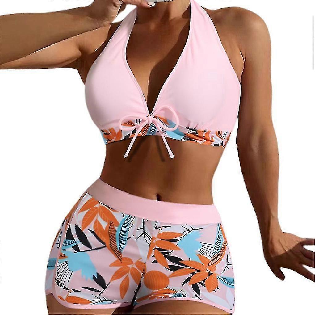 Lady Leaf Print Bikini Set Halterneck Bra Top High Waist Boy Shorts Swimsuit Summer Beach Swimwear