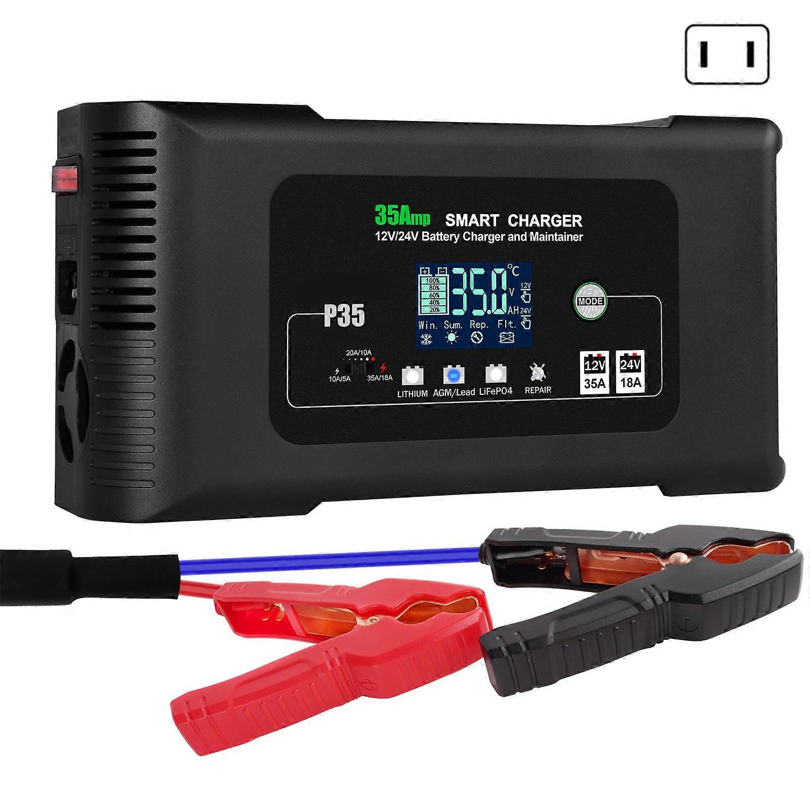 Features: [intelligent Car Battery Charger] 35A car battery charger supports 12V and 24V lithium batteries, acid batteries (Flood, WET, EFB) for charging car, trucks, SUVs, motorbikes, lawn mowers and boats. [intelligent Design for More Safety] Car Battery Maintainer Hot and Cold Weather Temperature Compensation System, the charger a variety of protections features to ensure safe charging. [VISUAL CHARGING] The car battery charger's large LCD screen displays charging and battery status; [Battery Reconditioning]Advanced battery reconditioning mode is used to recondition and store old, idle and damaged batteries for longer life. [EASY TO USE] No complicated step you can charge your battery without leaving home, 9-stage charging process, precise optimisation of the battery, smooth optimisation of battery power. Specifications: input: AC100-240V 50/60Hz Output voltages: 12V/24V Charging current: 35A (12V), 18A (24V) Minimum start voltages: 2V Load power: 450W Size: Approximately 230x112x65mm/9.05x4.4x2.55in Suitable for: lithium/lithium iron phosphate/acid (EFB, MF, FLOOD, VRLA and wet batteries.) Package Includes: 1PC 35A car battery charger 1PC power cord 1PC cable clamp 1PC manual note: Due to problems of lighting effects, there might be tolerances in product, please understand. Please allow 0-1cm error due to manual measurement.