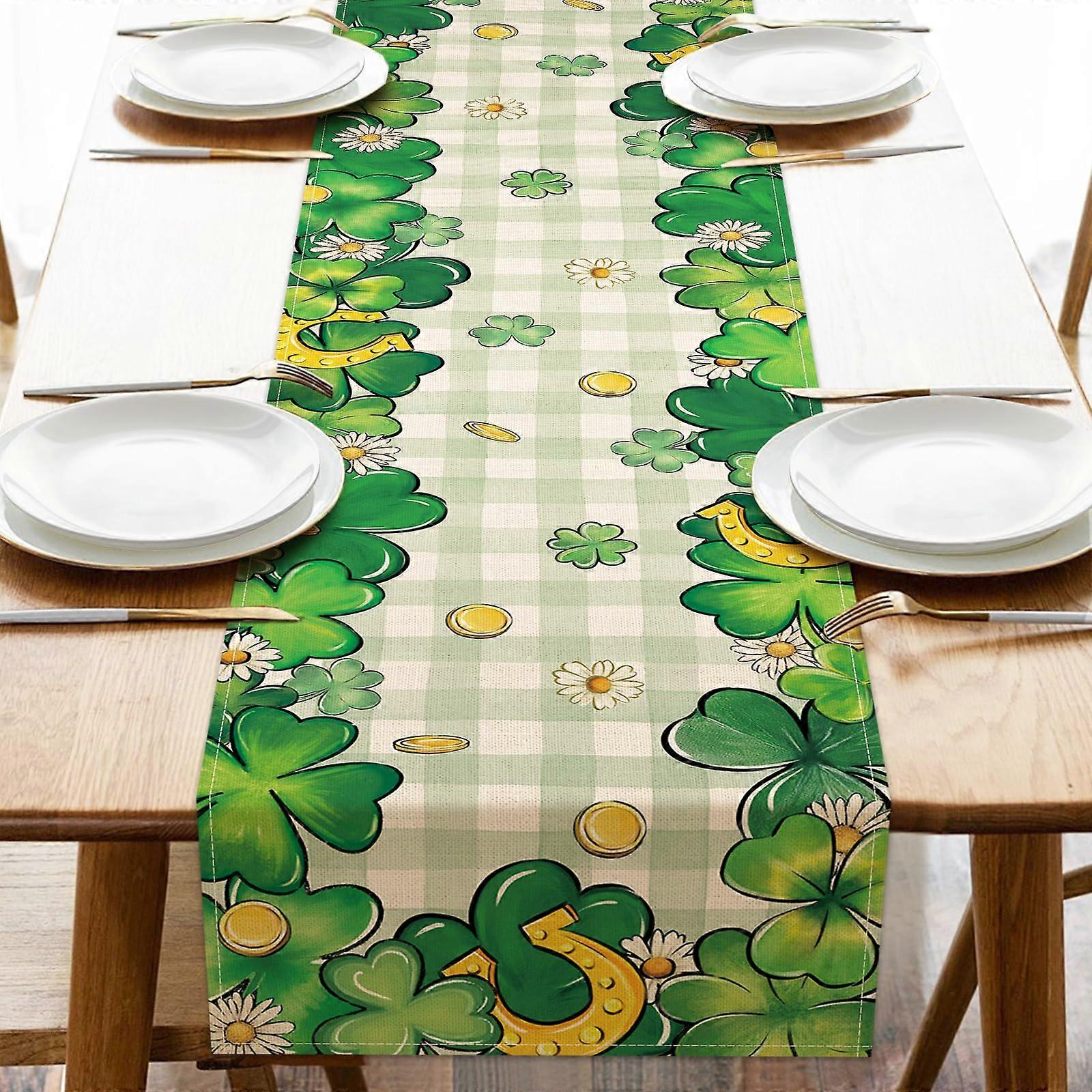Shamrock Horseshoe Daisy Plaid Farmhouse Table Runner for Kitchen Dining Table Decor Indoor Outdoor Party Supply 13 x 90 Inches