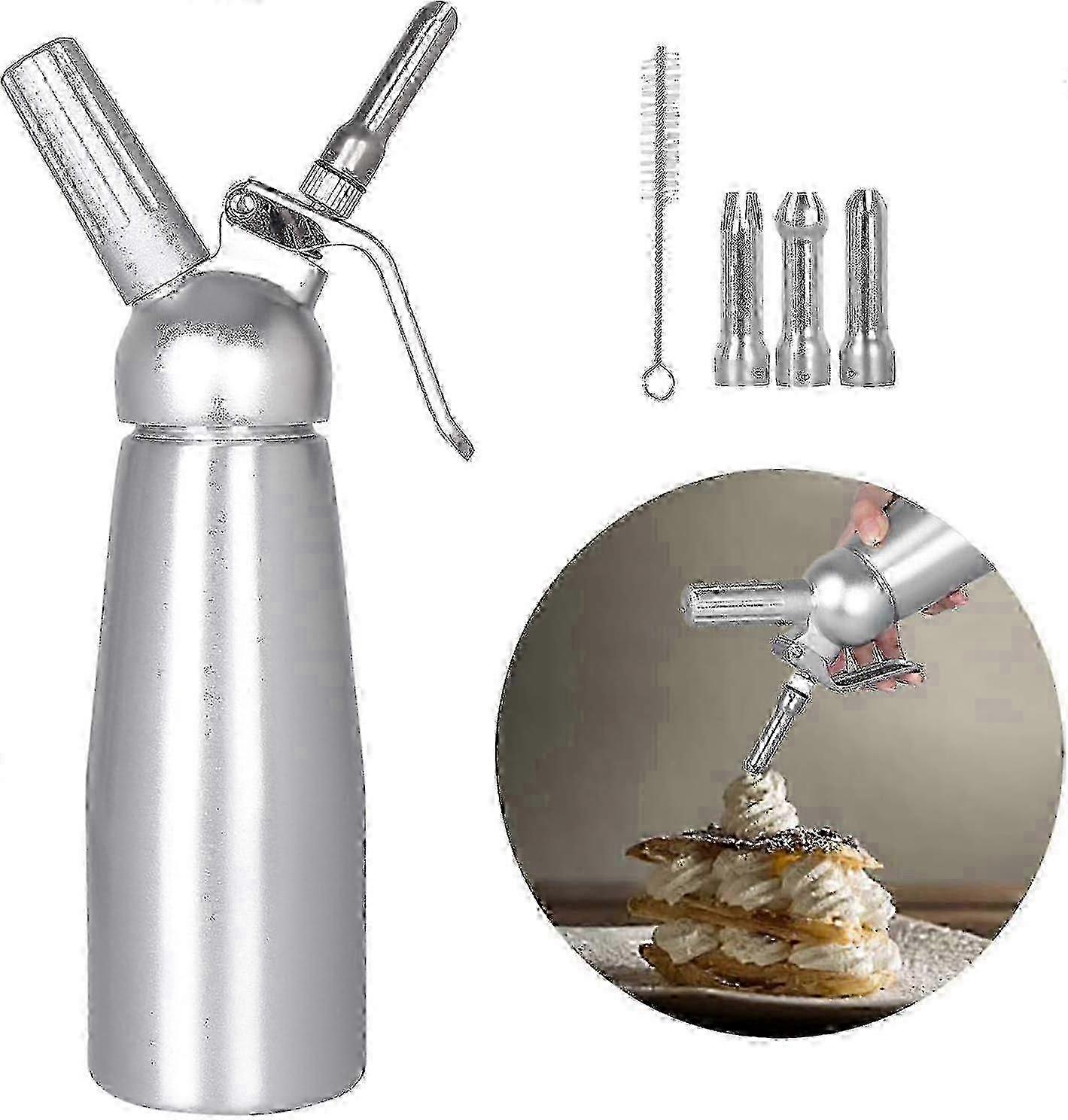 Professional cream whisk: The sturdy aluminum body and head ensure product durability, long service life and safety High quality: 500ml cream dispenser convinces with high quality materials, aluminum shell + best head cream, durable Easy to use and clean: Prepare creams, mousses, desserts, cold bubbles and seasonings, ideal for decorating cappuccino, coffee, milkshakes and ice cream. with the brush And it comes with the brush to easily clean small parts Various accessories: including 3 different nozzles for personalized design and decoration and cleaning tools Scope: Whether cream or seasoning, it is suitable for cold and hot preparations. Three decorating tips can give an unforgettable professional look to your cakes, cakes, waffles and cold / hot drinks. Product 500ML Chantilly siphon Edible Safety: Made of high quality aluminum material, which looks good and is durable to use, safe to eat. 3 nozzles: 3 stainless steel nozzles give your pies, cakes, waffles, drinks and mousse an unforgettable professional look (N2O cartridges are not included). Widely used: it is not only very suitable for daily use around the kitchen, but also ideal for cafes, restaurants, ice cream parlors, especially pastry chefs! Note: 1. Before filling the whisk, please cool it in cold water or in the refrigerator. 2. Use only soluble ingredients. 3. To sweeten, make sure the sugar crystals are completely dissolved or use a liquid sweetener. Specification: Material: Aluminum Color: Silver Capacity: 500 ml Size: 27 x 7.5cm / 10.6 x 2.9inch Package Included: 1 x whipped cream dispenser 1 x cleaning brush 3 x nozzles 1 x User Manual