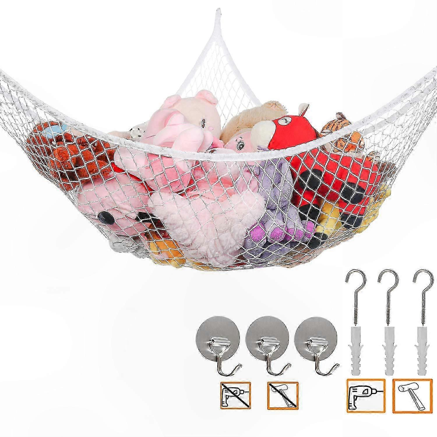 Perfect Stuffed Animal Organizer: This toy hammock can hold plush toys, dolls, balls, blankets, and light sports equipment. It serves as an alternative to bean bags, storage boxes, bins, and baskets. Giant Size: Our stuffed animal hammock measures 70x47x47 inches. The mesh toy hammock is large enough to hold all children's toys and provides a great storage solution for stuffed animals, built to last for long-term use. Great Toy Hammock Net: Keep your home neat and organized with this quality mesh hammock, ideal for toy storage in bedrooms and playrooms. Helps save space and reduces time spent cleaning up. Stretchy Rip-Resistant Material: The toy hammock is made of woven polyester mesh with a durable elastic border, allowing it to stretch and accommodate various toy sizes. Easy Installation: Our jumbo toy hammock is easy to install. Includes 3 drill-free adhesive hooks (recommended to attach to a smooth wall and wait 24 hours before use; for weights over 5kg, use the included hanging hooks with anchors) and 3 additional drill hooks with anchors, giving you flexible mounting options.