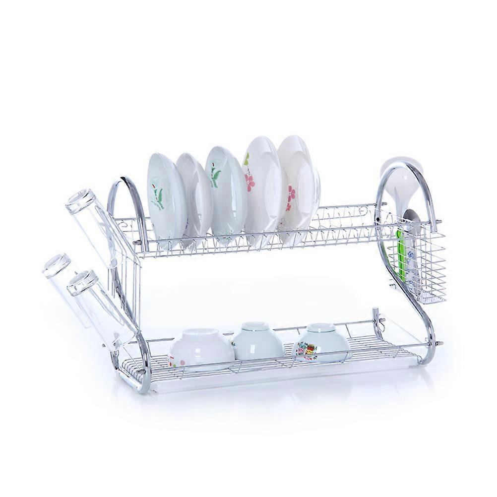 Metal Dish Drainer 2-Tier Dish Cup Drying Rack for Home Kitchen Silver Stainless Steel Organizer Tray 1Set