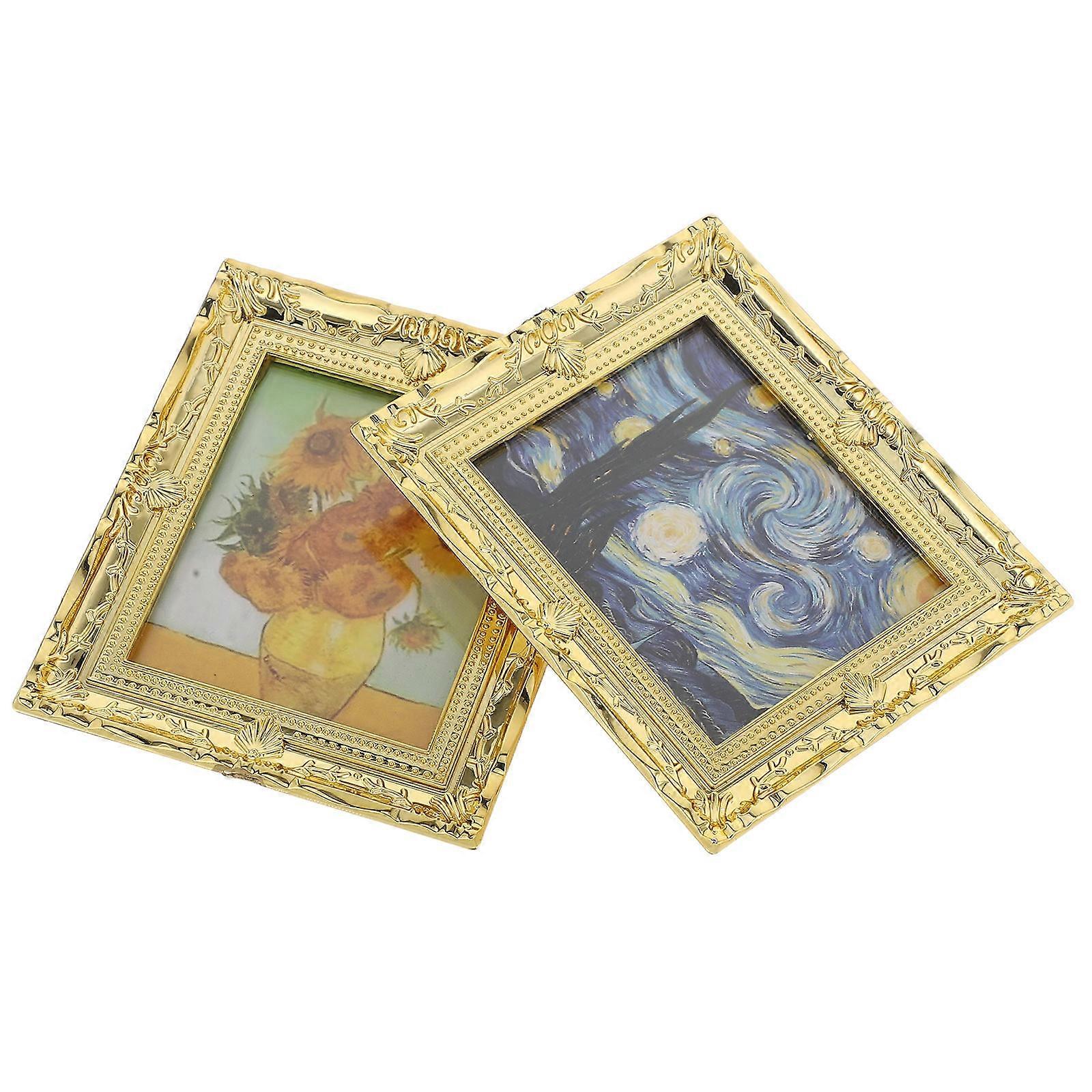 Tiny Oil Painting Craft Gold Wall Picture Mini House Decoration Rectangular Imaginary Play 2Pcs