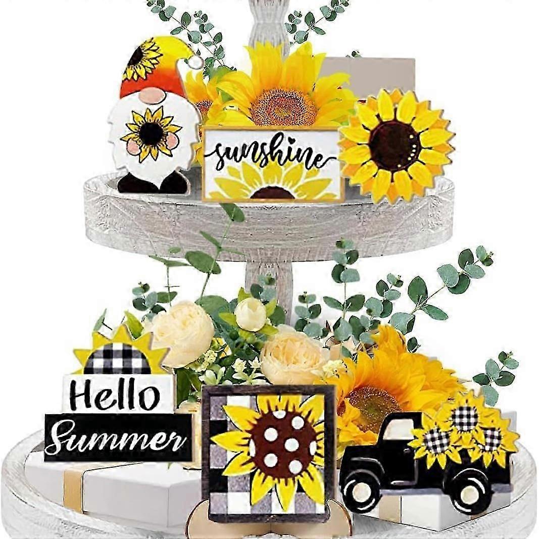 Summer Tiered Tray Decor, Farmhouse Sunflower Tray Decorations, Hello Spring Summer Sunflower Gnome Sunshine Truck Wooden Signs, Buffalo Plaid Rustic