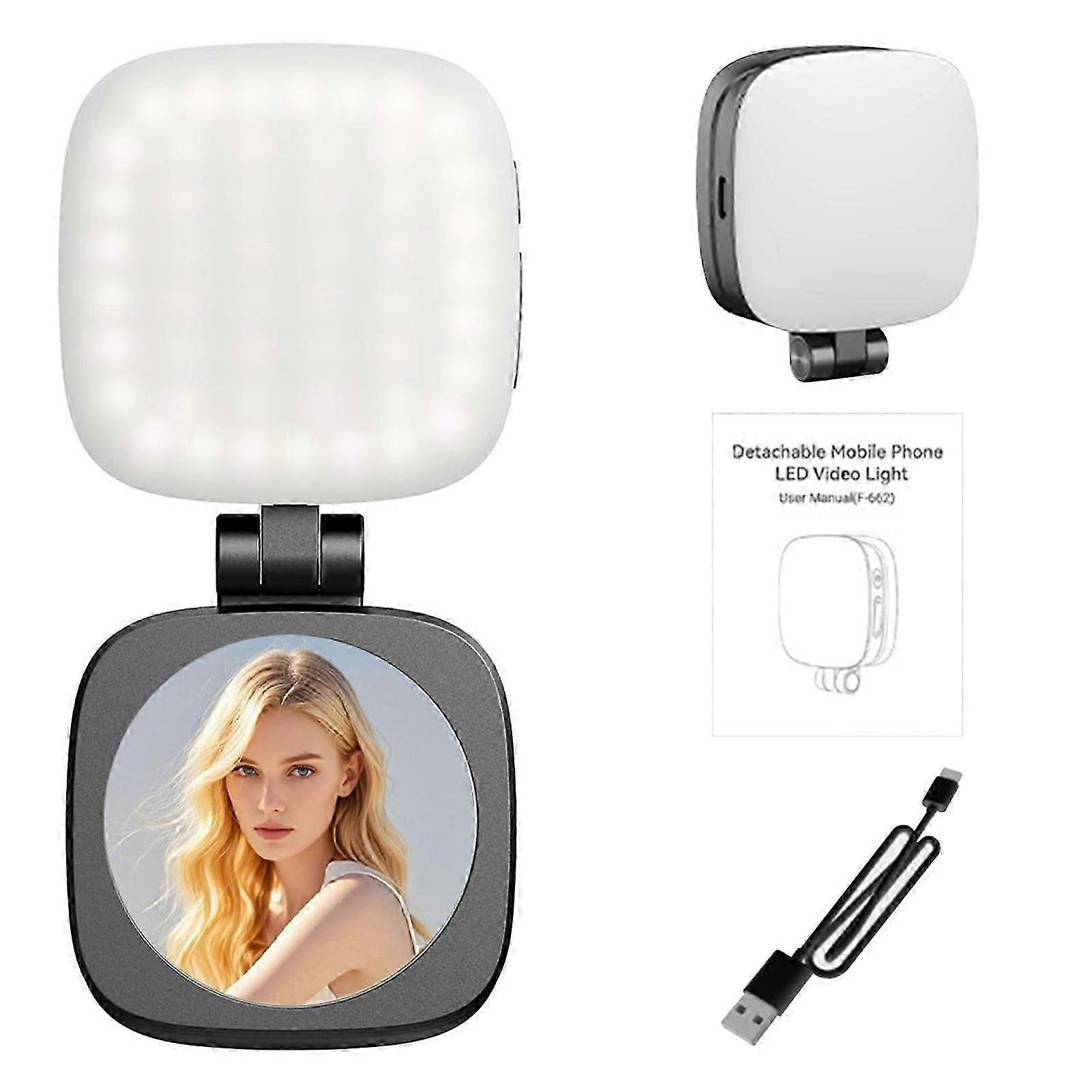 Features: Secure Magnetic Attachment: No more slipping or shifting snaps firmly to your phone with built-in Mag-Safe compatibility or the included magnetic pad for Androids devices. Studio-Quality Lighting Anywhere: Choose from 3 color temperatures (3000K-6500K). Get the perfect glowing, from soft sunset tones to bright daylights clarity Portable Compact Design: Experience on-the-go convenience with a compact design reminiscent of a powder compact, ensuring lightweight portability for easy travel and outdoor use Convenient Built-In Glass Mirror: Benefit-from a handy mirror feature for quick touch-ups and checks, making grooming routines and quick adjustments easier on-the-go Power That Lasts: Say goodbye to interruptions with an 850mAh lithiums battery and USB C charging, giving you up to 90 minutes of continuous full-power use Notice: 1.Actual color may be slightly different from the image due to different light effect 2.Please allow 1-3cm deviation due to manual measurement Description Lamp beads: 48 lamp beads Power: 2W Lighting mode: white light, cold and warm light, warm light Battery capacity: 850 mAh Color temperature range: 3000-6500K Power supply interface: type-c Rated voltage: 5V/1A Accessories: magnetic pad Package List: 1x Magnetic Selfie Light