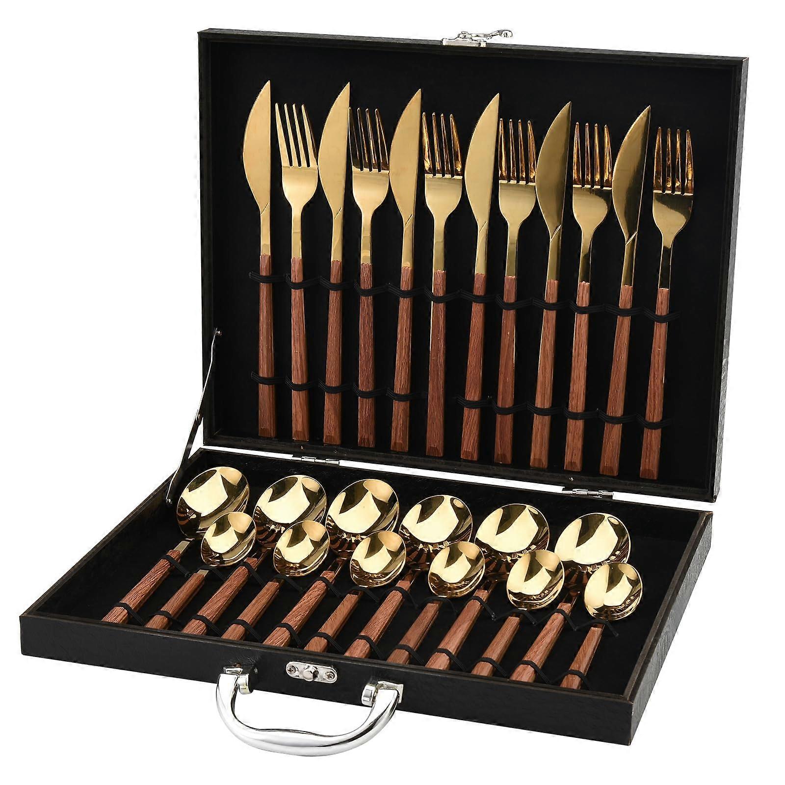 24-Piece Gold Stainless Steel Set Cutlery Set, Non-Slip, Non-Scalded Wooden Handle Sets High-Grade Mirror Polishing Cutlery Set - Gold