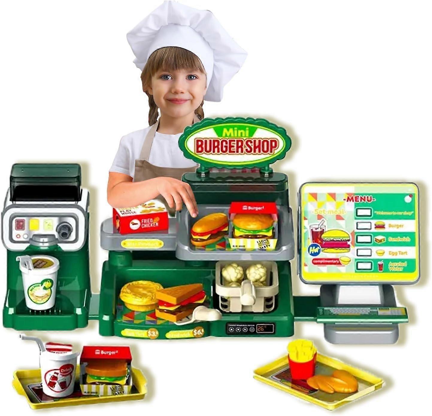 Kids 35Pcs Pretend Cashier Toy Set Includes Scanner, Coffee Machine & Dummy Food Burger Kids Ages 3+ Green Burger Shop