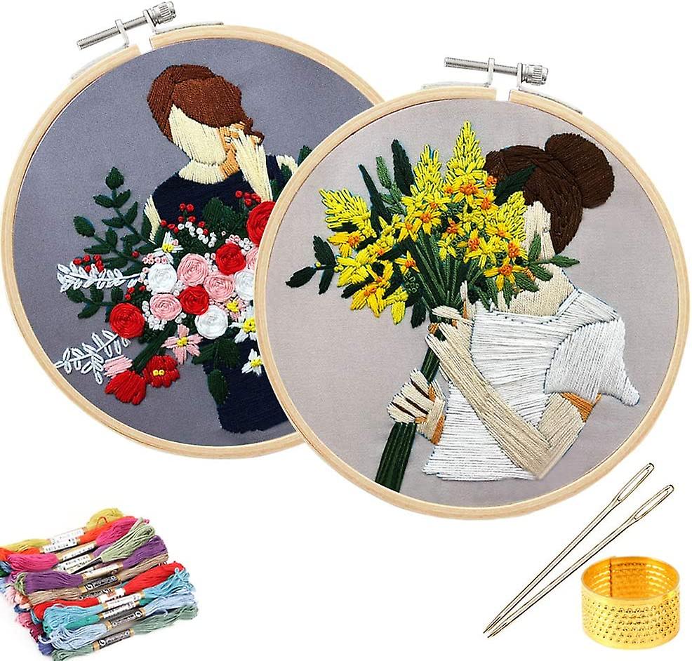 DIY Embroidery Starter Kit with Pattern Full Range of Stamped Embroidery Kits with Instructions, Embroidery Clothes with Girls Holding Flowers Pattern