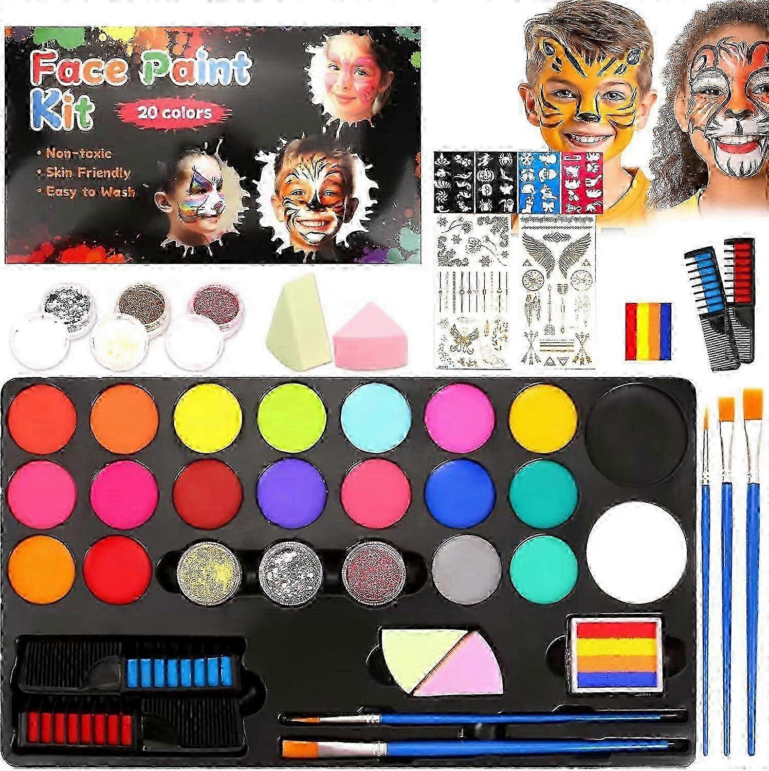 [Professional Kits]: Our face painting kit includes 20 colors face painting palettes + 1 rainbow split cake + 3 glitter powders + 2 hair coloring clips + 41 reusable stencils + 2 sticker + 2 brushes + 2 sponges.<br> [Safe and Gentle]: Made of non-toxic, hypoallergenic and washable ingredients, which is more safe. The texture is light and breathable and will not add burden to the skin. Safe for adults and children alike.<br> [Great Coverage]: Smooth application and rich colour. High coverage is not easy to smudge, which can make your makeup last longer and give off charming colors at parties.<br> [Easy to Clean]: Premium formula is washable and gentle to sensitive skin. Mix a few drops of water into the paint and simply mix well with a brush to draw a gorgeous colourful pattern. It can be easily removed by using water or a wet tissue.<br> [Wide Use]: Ideal for school, sporting events, community events, Halloween or other festivals. Let your imagination run wild and concoct fabulous moments for parties and special occasions, bringing more moments of fun.