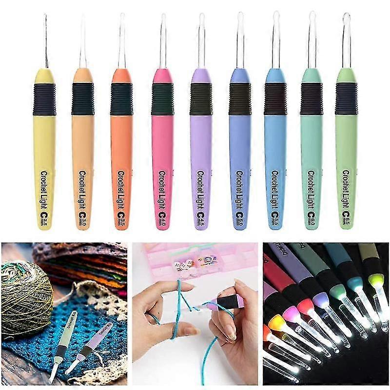 FEATURE: Ergonomic Crochet Hooks: Designed with extremely comfortable silicone grips that are easy to maneuver for long crocheting sessions, giving you precise control that allows you to create extremely detailed designs. Our lighted crochet hook set is perfect for those with rheumatoid arthritis or carpal tunnel. Crochet Anywhere, Anytime: Want to crochet effortlessly and see clearly even with the darkest yarn, even in low light? You'll never have to stop or slow down again because of bad or dark yarn when using Yarn Story Yarn Story crochet hooks. The LED light at the end of the hook brightens the area and brings details into focus. Complete Crochet Kit: LED crochet hooks in sizes C to K that are color coded. One of each size: C (2.5mm), D (3.0mm), E (3.5mm), F (4.0mm), G (4.5mm), H (5.0 mm), I (5.5mm), J (6.0mm) and K (6.5mm). Our lightweight crochet hooks also come with a perfect red crochet hook. Store all your glow hooks in this durable and waterproof crochet hook case and never worry about losing crochet hooks or crochet hooks again Perfect Gift Idea: Yarn Story crochet hooks make the perfect crochet gift Comes ready in a crochet bag and gift box. Perfect for Mother's Day, Birthdays, Christmas or just as a unique gift to surprise someone you know who "has everything". SPECIFICATION: Color: As the picture shows Size: C(2.5mm), D(3.0mm), E(3.5mm), F(4.0mm), G(4.5mm), H(5.0mm), I (5.5mm), J (6.0mm) and K (6.5mm) Package includes: 1 x Led Crochet Set (9pcs)