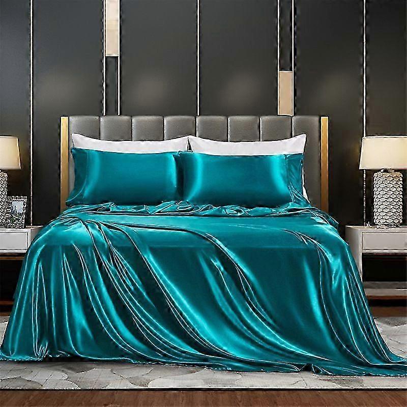 Solid color satin imitation silk four-piece set European and American simple bed sheet pillowcase bedding four-piece set 152*203+36cm (blue-green)