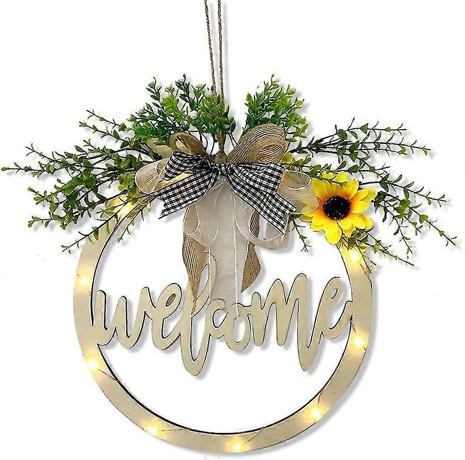 Welcome Sign, Wooden Welcome Door Wreath with LED Fairy Lights, 30cm Welcome Sign for Porch Decor We