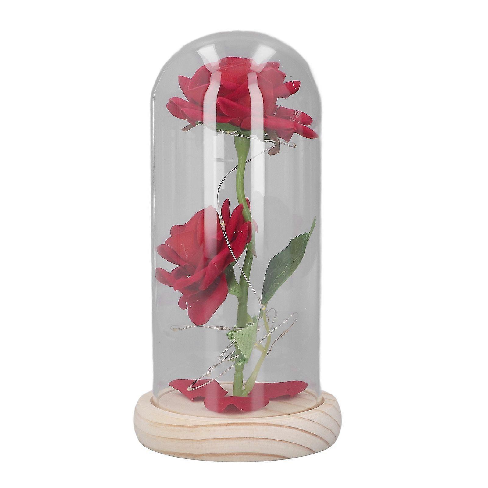 Valentine Day Artificial Flowers Glass Decor LED Light Wooden Base 2 Roses Ornaments for Girlfriend