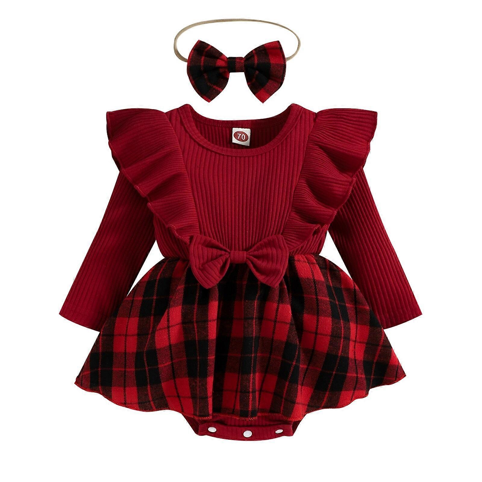 Christmas Infant Baby Girls Romper Dress Plaid Round Neck Ruffles Long Sleeve Bowknot Skirt Hem Jumpsuits with Headband