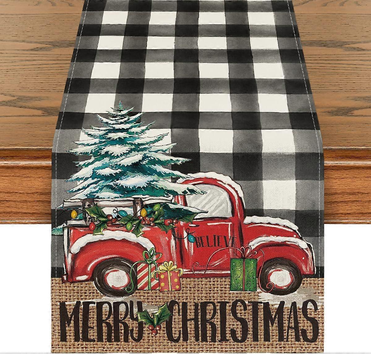 Merry Christmas Tree Table Runner, Seasonal Truck Gifts Kitchen Dining Table Decoration 13x72 Inch-Black/White