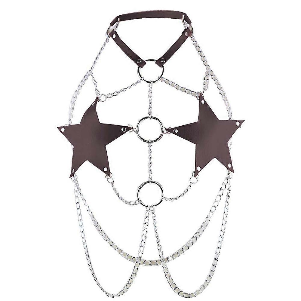 Punk Style Sexy Women Pentagram Bundle Chain PU Leather Strap Body Chest Jewelry(Dark Brown)