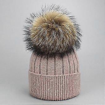 فتاة النساء الشتاء الصوف قبعة صغيرة الراكون الحقيقي الفراء بوم بوم الوالد والطفل محبوك قبعة الأساسية الغزل الدافئة عارضة الجماجم بيني العظام جيدة