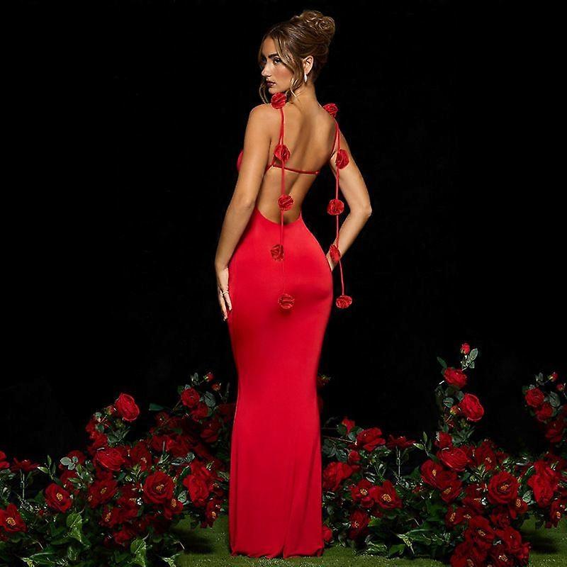 Women's Evening Dress With Backless Straps, Three-Dimensional Flower Decorations And Strappy Long Dresses